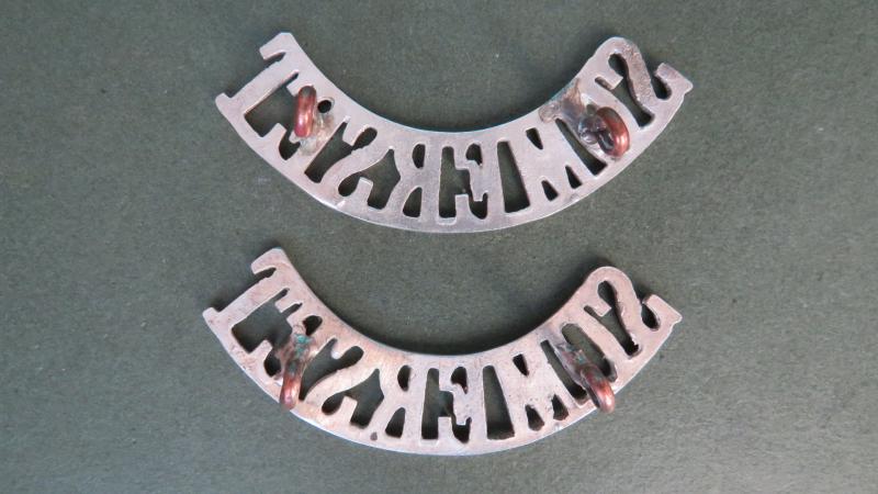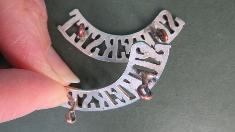 white metal titles with 2 loop fixings in very good condition are a variation of number 1051 in Ray Westlake's Book, Collecting Metal Shoulder Titles..