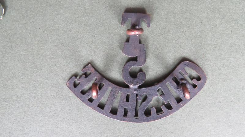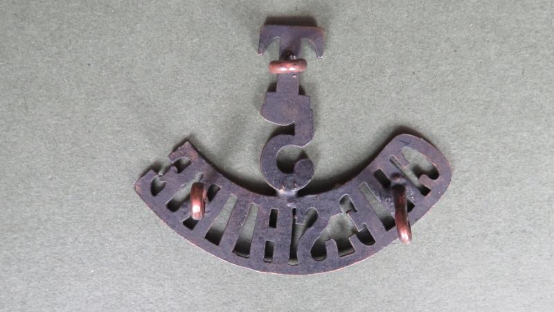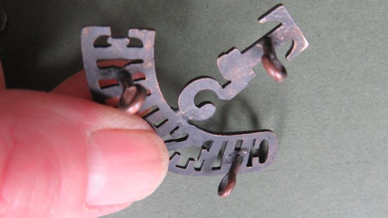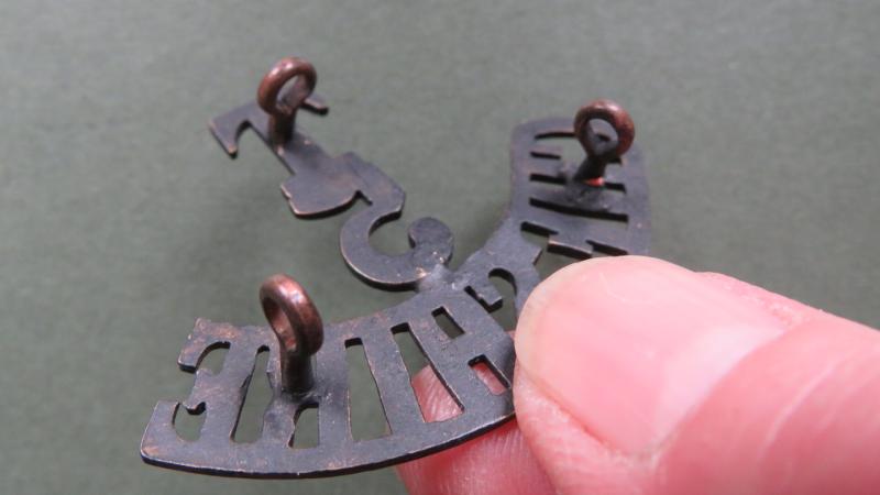 darkened gilding metal title in very good condition and mentioned on page 83 in Ray Westlake's Collecting Metal Shoulder Titles. Complete with 3 loop fixings