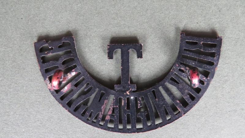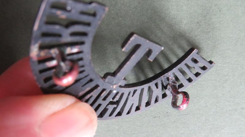 darkened gilding metal title in good condition and 1186 in Ray Westlake's Collecting Metal Shoulder Titles. Complete with 2 loop fixings